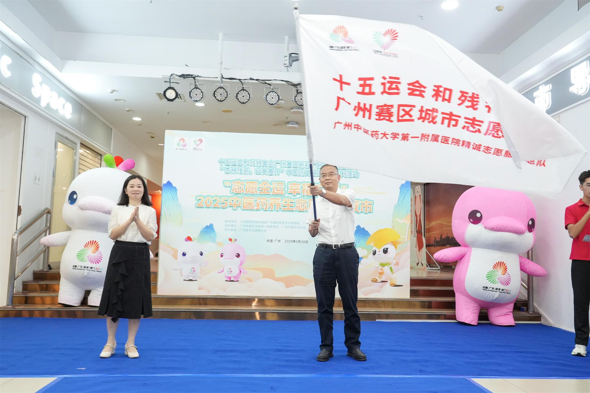 现场,共青团广州市委副书记刘韵华代表十五运会和残特奥会广州赛区执委会志愿者部,为广中医一院精诚志愿服务总队授旗并颁发感谢状。