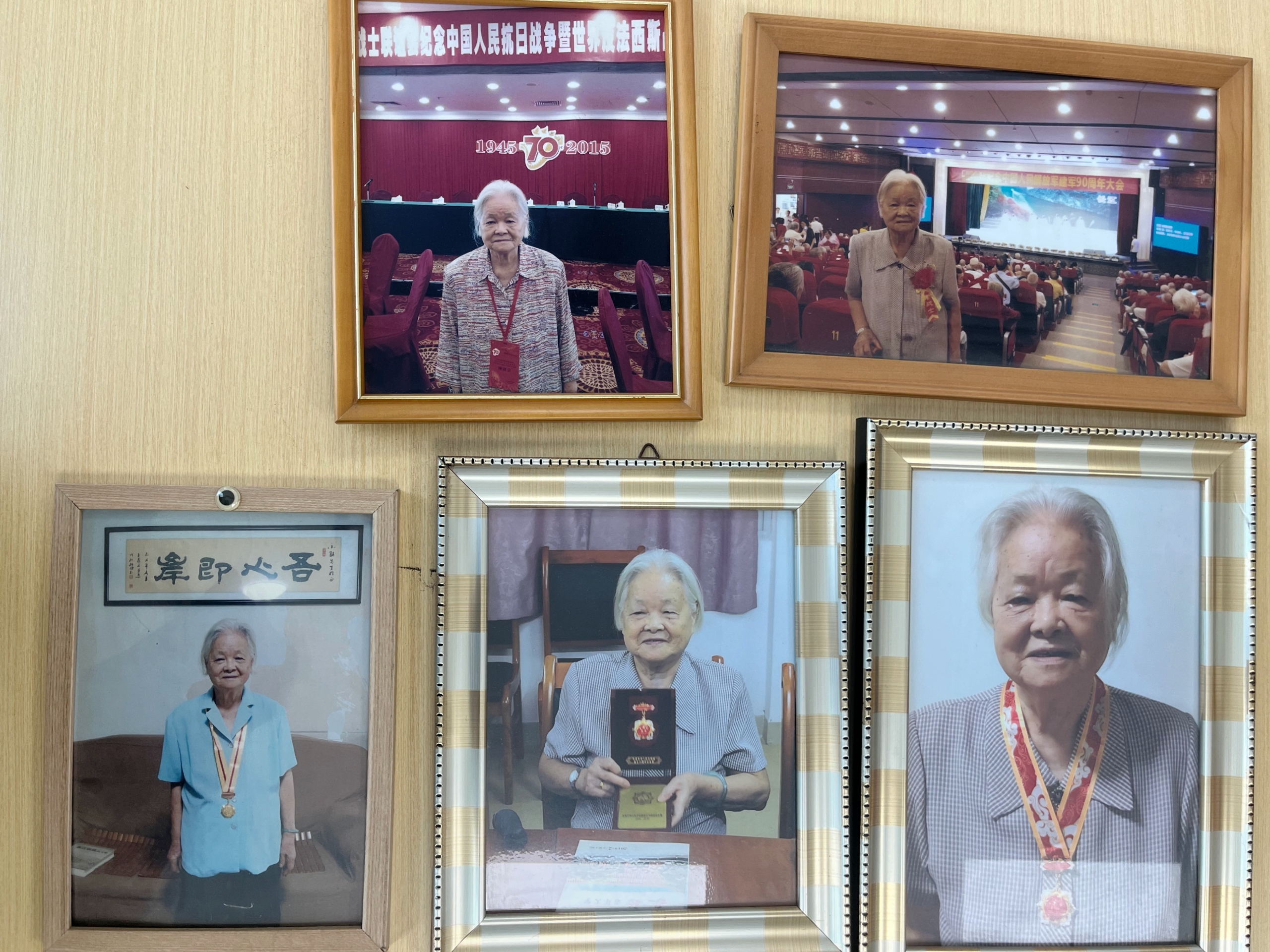 即将迎来阅兵,子女们也特意将温永兰获得的勋章一并带来病房:东江纵队成立五十五周年纪念章、庆祝中华人民共和国成立70周年纪念章、中国人民抗日战争胜利70周年纪念章......十年前,温永兰还出席了东江纵队老战士联谊会,照片上的她虽然白发苍苍,却显得很精神。