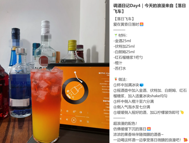 最近,社交平台上涌现出很多的“微醺博主”,它们常常分享各种美颜的调味酒,粉紫渐变的莫吉托、缀满樱花的马天尼、落日飞车、椰林飘香等,还有各种便利店调酒,这些调制后的鸡尾酒颜色绚丽,十分吸引人,再加上“微醺不醉”的口号,让不少女性看到后跃跃欲试。