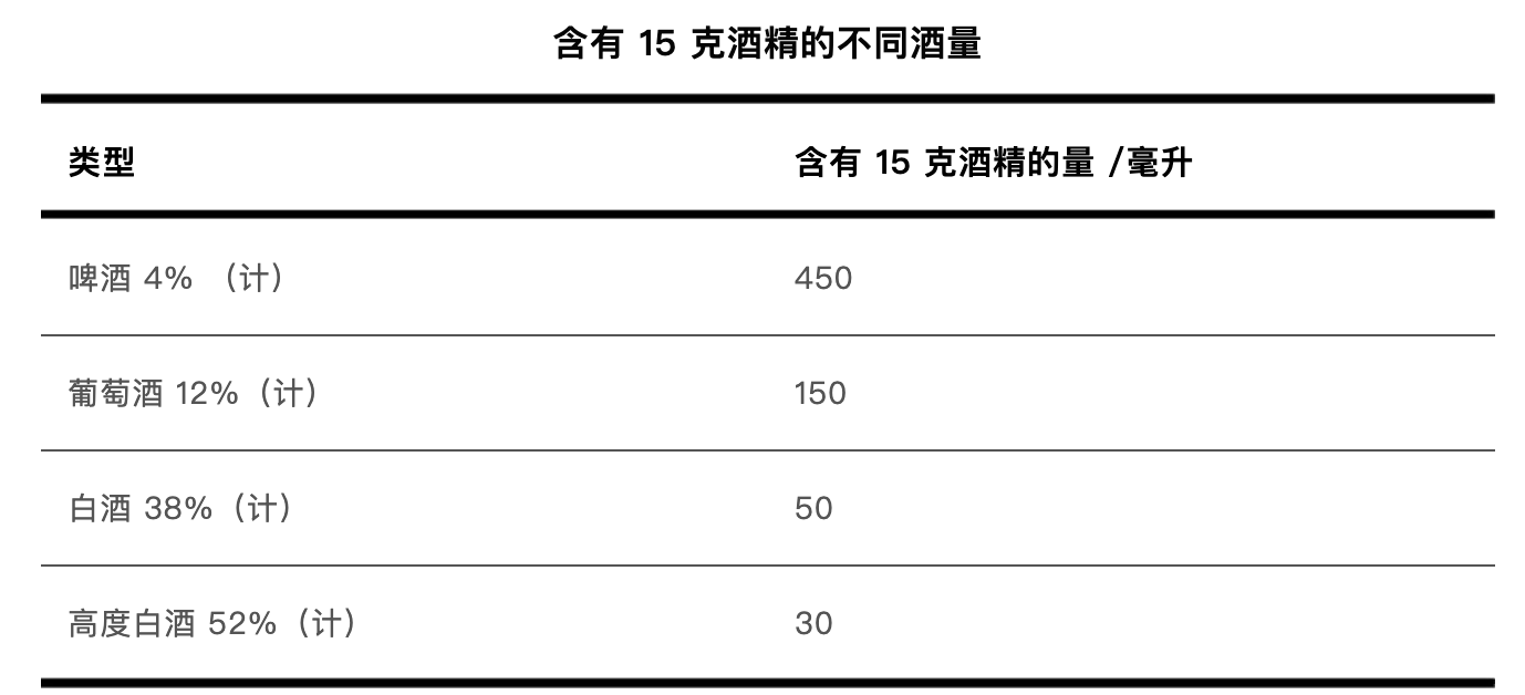 注意每天的酒精摄入量不超过15克,相当于啤酒(4%)450ml,葡萄酒(12%)150ml,白酒(38%)一两(50ml),高度(52%)白酒30ml。