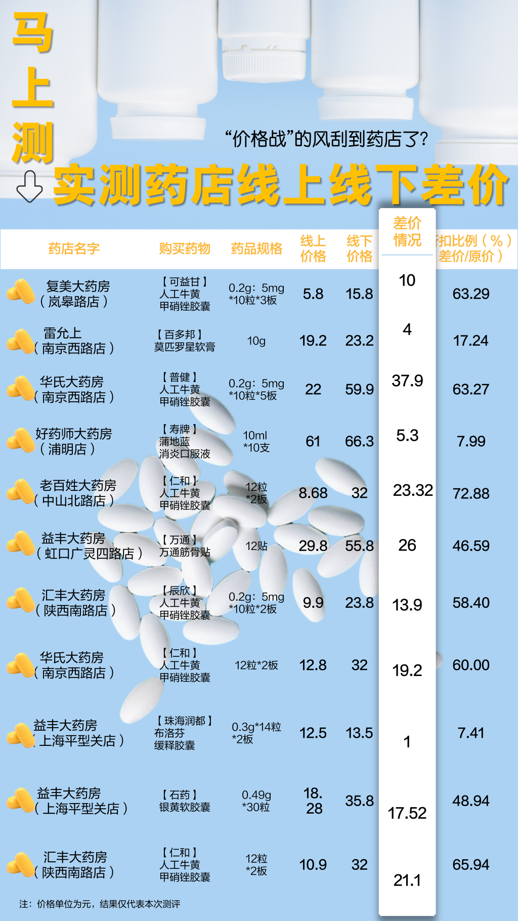 比如:复美大药房(岚皋路店)的“可益甘”人工牛黄甲硝唑胶囊(规格0.2g: 5mg*10粒*3板),线上价格5.8元,线下价格15.8元,差价10元;雷允上(南京西路店)的“百多邦”莫匹罗星软膏(规格10g),线上价格19.2元,线下价格23.2元,差价4元;华氏大药房(南京西路店)的“普健”人工牛黄甲硝唑胶囊(规格0.2g: 5mg*10粒*5板),线上价格22元,线下价格59.9元,差价37.9元;好药师大药房(浦明店)的“寿牌”蒲地蓝消炎口服液(规格10ml*10支),线上价格61元,线下价格66.3元,差价5.3元。
