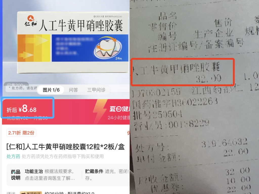 比如老百姓大药房(中山北路店)的“仁和”人工牛黄甲硝唑胶囊(规格12粒*2板),线上价格8.68元,线下价格32元,差价达23.32元。