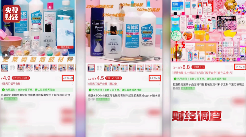 除了成品软泥类玩具,各种自制软泥套装的销量也很高,这些套装里的核心材料是胶水和成型水。