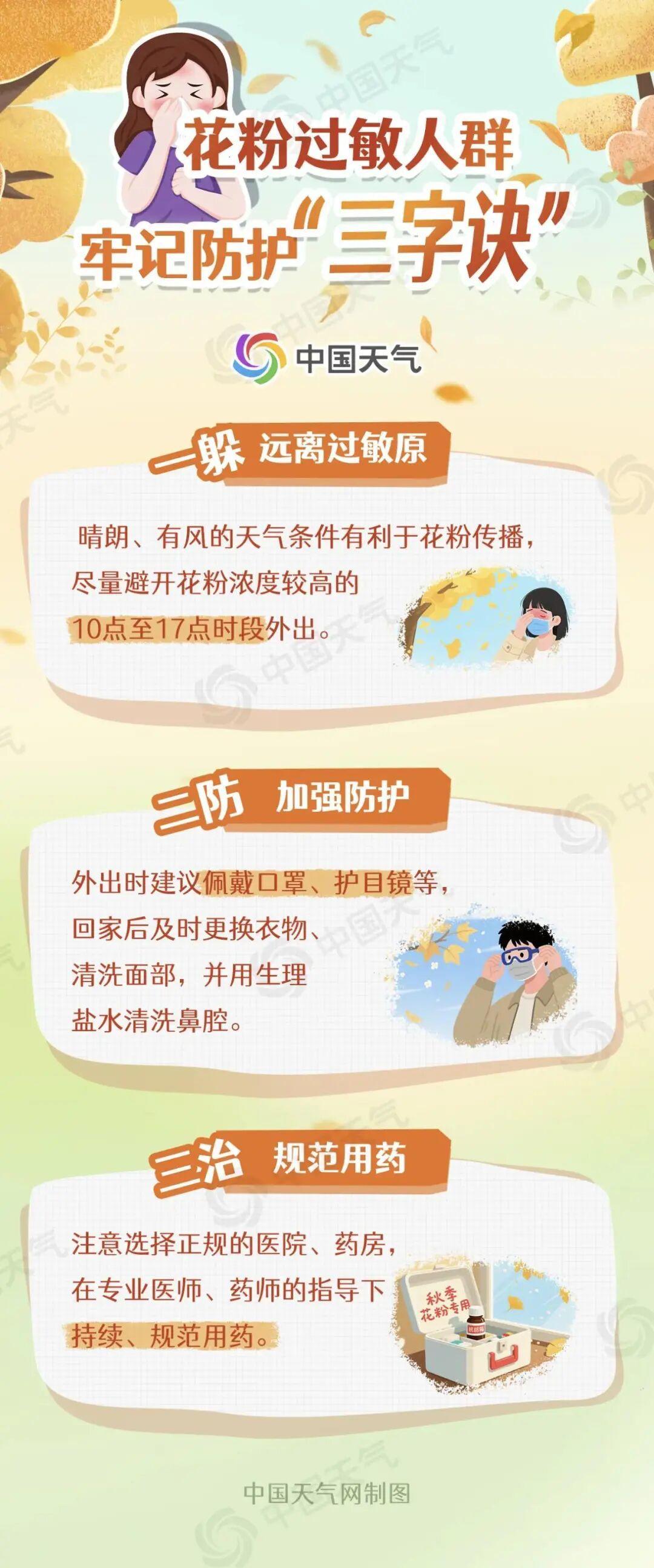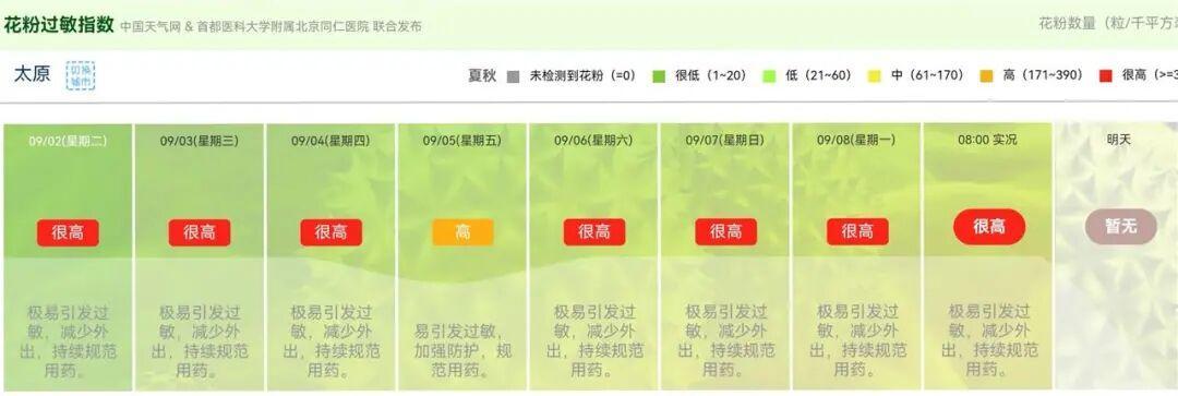 根据中国天气网和首都医科大学附属北京同仁医院联合发布的花粉过敏指数显示,太原市自9月2日以来的指数,有7天为“很高”、1天为“高”。中国天气网发布科普文章,提醒花粉过敏人群牢记“三字诀”:一是躲,远离过敏原;二是防,加强防护;三是治,规范用药。