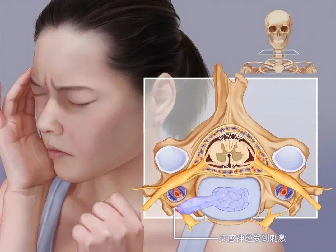 2. 交感型颈椎病:由交感神经受刺激引起,症状多样但程度较轻。常表现为颈肩酸胀发紧,可伴随头痛、头晕及偶尔的上肢发麻,检查时多无明显器质性病变。