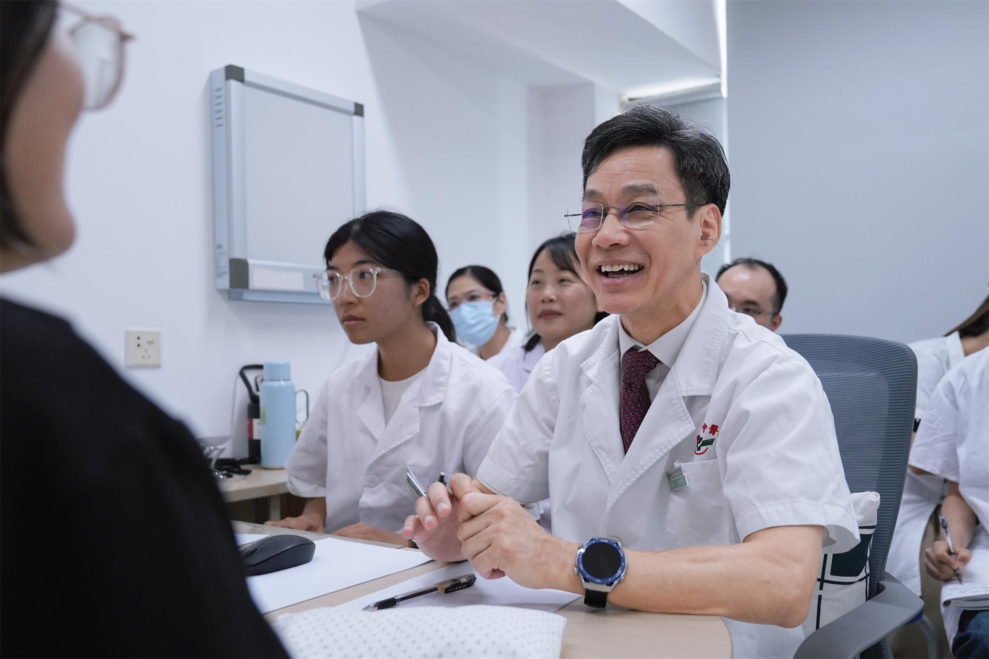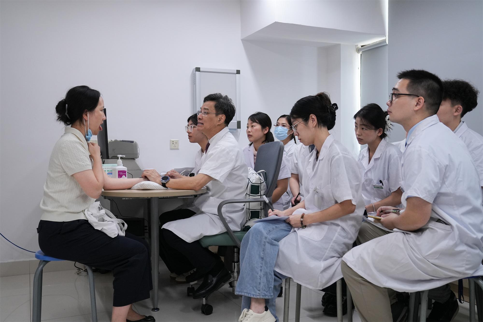 9月9日当天,从下午1点半到当晚6点,德叔马不停蹄地一共看了67个号。记者走进诊室探班,当天团队跟诊的成员就有12人,分工明确。有人负责预问诊,在门口紧密衔接,亲自带入诊室;每位患者看诊结束,也会有一位医生带出来,亲自交代注意事项。整个流程衔接紧密顺畅高效。但患者与德叔的交流,很自然很放松,没有时间限制。