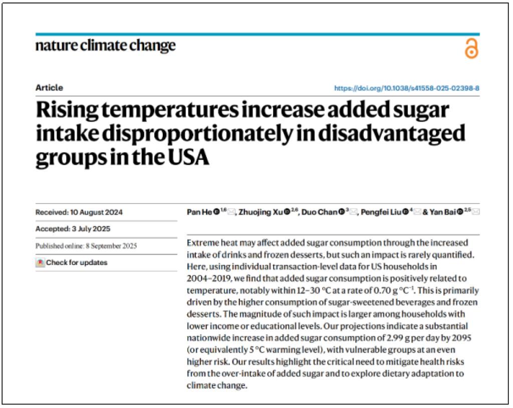 近日,《自然-气候变化》杂志发表一篇论文,通过2004至2019年美国家庭个体交易数据研究发现,在12°C至30°C的范围内,气温每升高1°C,每人每天的添加糖摄入就会增加0.7克。
