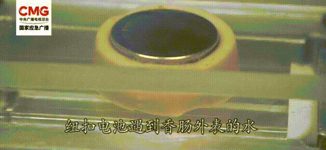 食道灼伤模拟实验。为直观模拟纽扣电池的破坏性,实验人员将一枚纽扣电池放在香肠上,电池遇到香肠里的水分,发生电解并产生碱性液体,很快香肠表面就被严重腐蚀。