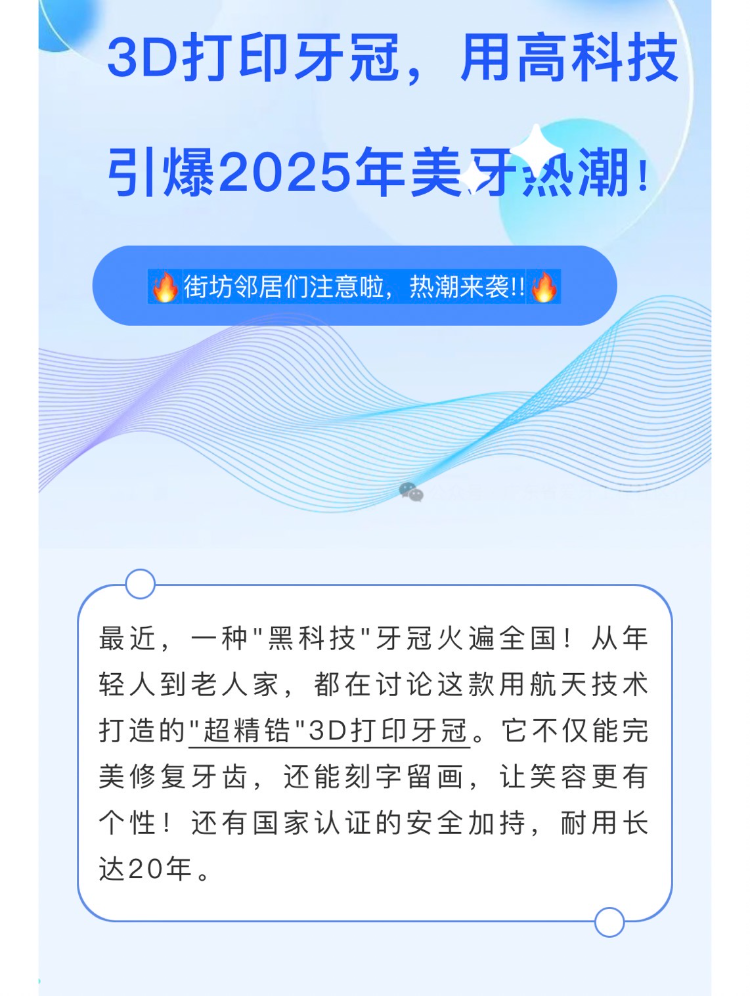 记者在社交平台发现,全国不少口腔机构正将“3D打印氧化锆牙冠,表面个性化定制图案”作为新的产品卖点推广。广东一家民营连锁大型口腔医院宣传称: "超精锆"3D打印牙冠运用航天材料技术打造,既能完美修复牙齿,还能在牙上实现双面刻字、花纹印刻,是独一无二的专属定制。