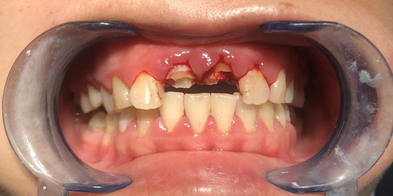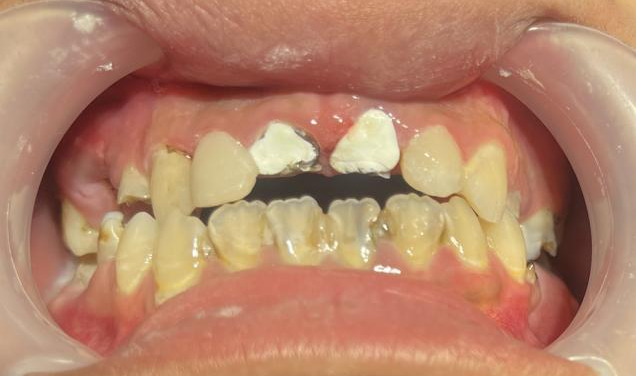 这名男孩就诊时满口黑牙,颜值大打折扣。广州市花都区人民医院口腔科结合放射检查、内科治疗、外科干预及修复重建等诊疗环节,制定了“拍片检查—牙周治疗—拔牙—根管治疗—桩冠修复”的系统性方案,后续还将为其缺失牙进行种植修复。