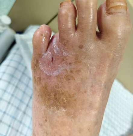 接诊后,伤口造口护理门诊谢小红护士长、专科护士肖晓梅立即启动糖尿病足“一站式”诊疗模式:内分泌科团队同步调整患者血糖、血压,为后续治疗筑牢基础;伤口造口护理门诊全程负责创面清创与换药,保持创面清洁;介入科隋成君主任、梁锦汉医生为患者开通闭塞血管,术后第4天,手外烧伤整形科罗子康主任、赵元元主治医师为其实施左足第4趾截除术,术中足趾血运良好。术后2周,患者伤口愈合良好。