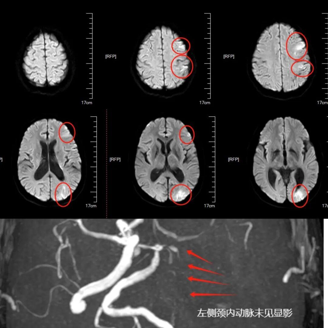入院时,薛先生嗜睡、混合性失语,右侧肢体力0级,NIHSS评分达18分,病情危急。因患者孤身、家属远在外地,医院立即开通卒中绿色通道,急诊团队迅速完成颅脑CT排除脑出血。鉴于发病时间不明无法静脉溶栓,结合症状神经内科医生高度怀疑颅内大血管闭塞,后续磁共振证实其左侧颈内动脉末端急性闭塞,大脑面临严重缺血危机。