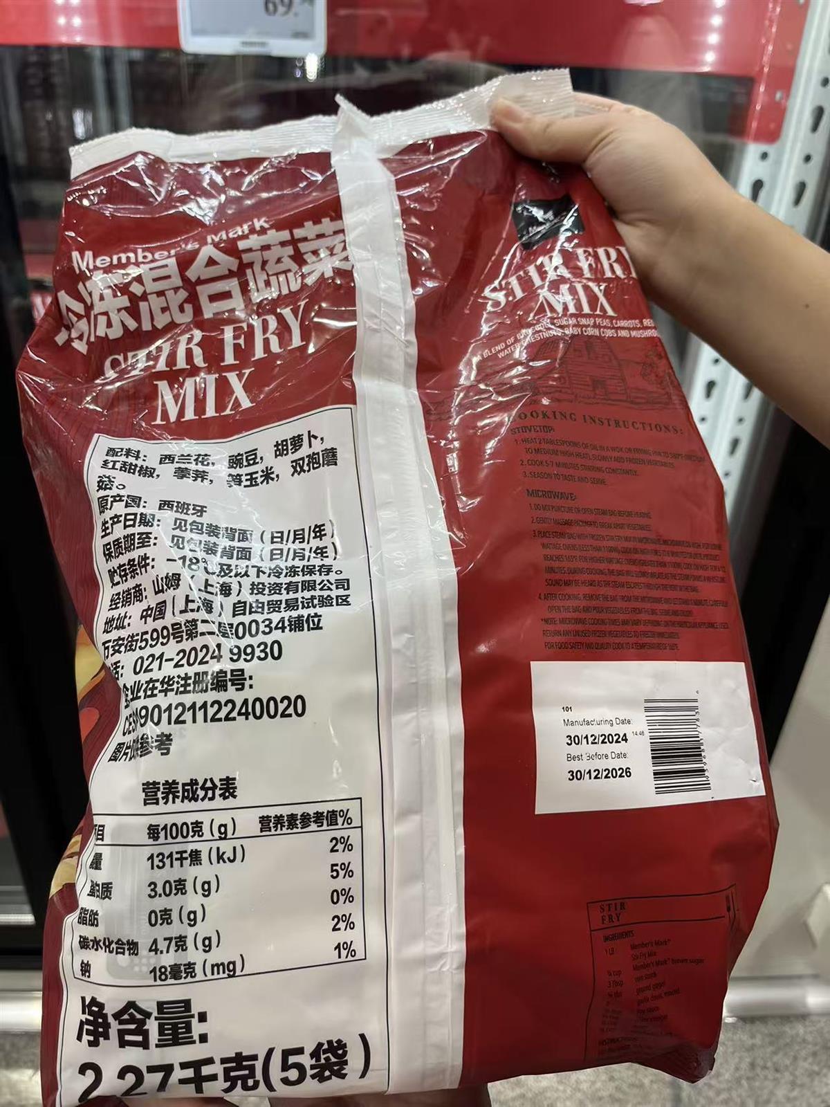 记者致电该山姆门店,询问去年12月生产的冷冻混合蔬菜是否新鲜,保质期两年的蔬菜营养是否会流失,一名工作人员表示,该款商品是冷冻锁鲜的,可以放心食用,不放心可以退。