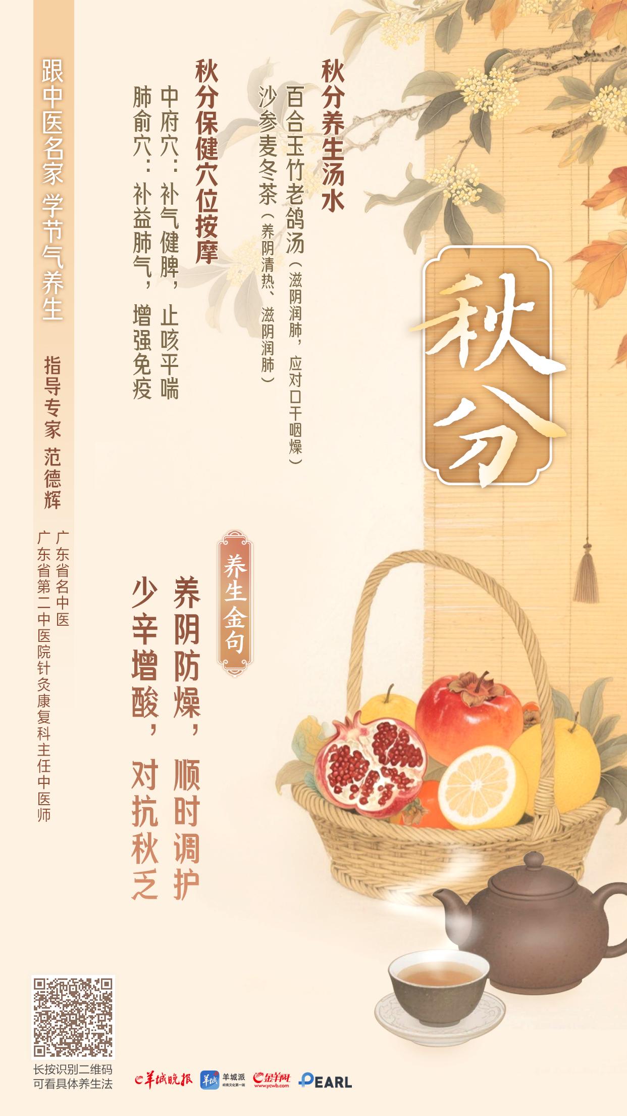 当秋风吹散暑气,昼夜终于在此刻达成平衡——秋分。作为二十四节气中第十六个节气、秋季的第四个节气,秋分不仅标志着“一场秋雨一场凉”的气候转折,更藏着古人“天人相应”的养生智慧。此时天气渐凉、空气干燥,人体易受“秋燥”侵袭,出现咽干舌燥、皮肤干裂、干咳少痰等不适;同时,自然界阴阳平分,正是调理身体、顺应季节变化的黄金时机。广东省名中医、广东省第二中医院针灸康复科主任中医师范德辉将从养生核心要点、专属养生汤水、穴位按摩技巧三方面,带您在秋分里让身体与自然同频。