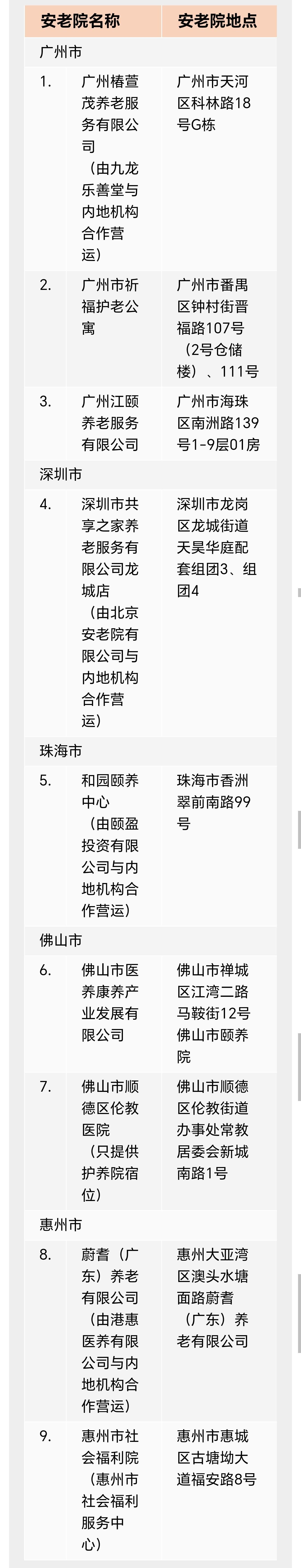据了解,连同现有15家养老机构,参与计划的养老机构总数将增至24家,分布于广州、佛山、深圳、中山、肇庆、江门、珠海和惠州的8个粤港澳大湾区内地城市,为香港长者跨境照顾服务提供更多选择。
