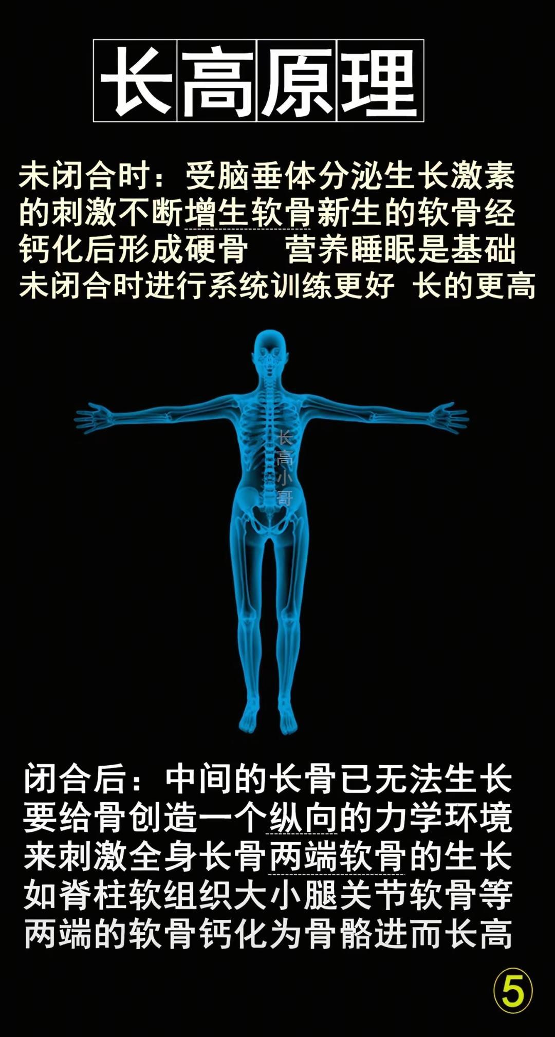 网络上另一个常见的“长高原理”则是:“(骨骺线)闭合后,中间的长骨已无法生长,要给骨创造一个纵向的力学环境来刺激全身长骨两端软骨的生长,如脊柱软组织大小腿关节软骨等。两端的软骨钙化为骨骼进而长高。”拥有9.8万粉丝的账号“长高训练营小哥”在自己置顶视频的图片中这样描述。