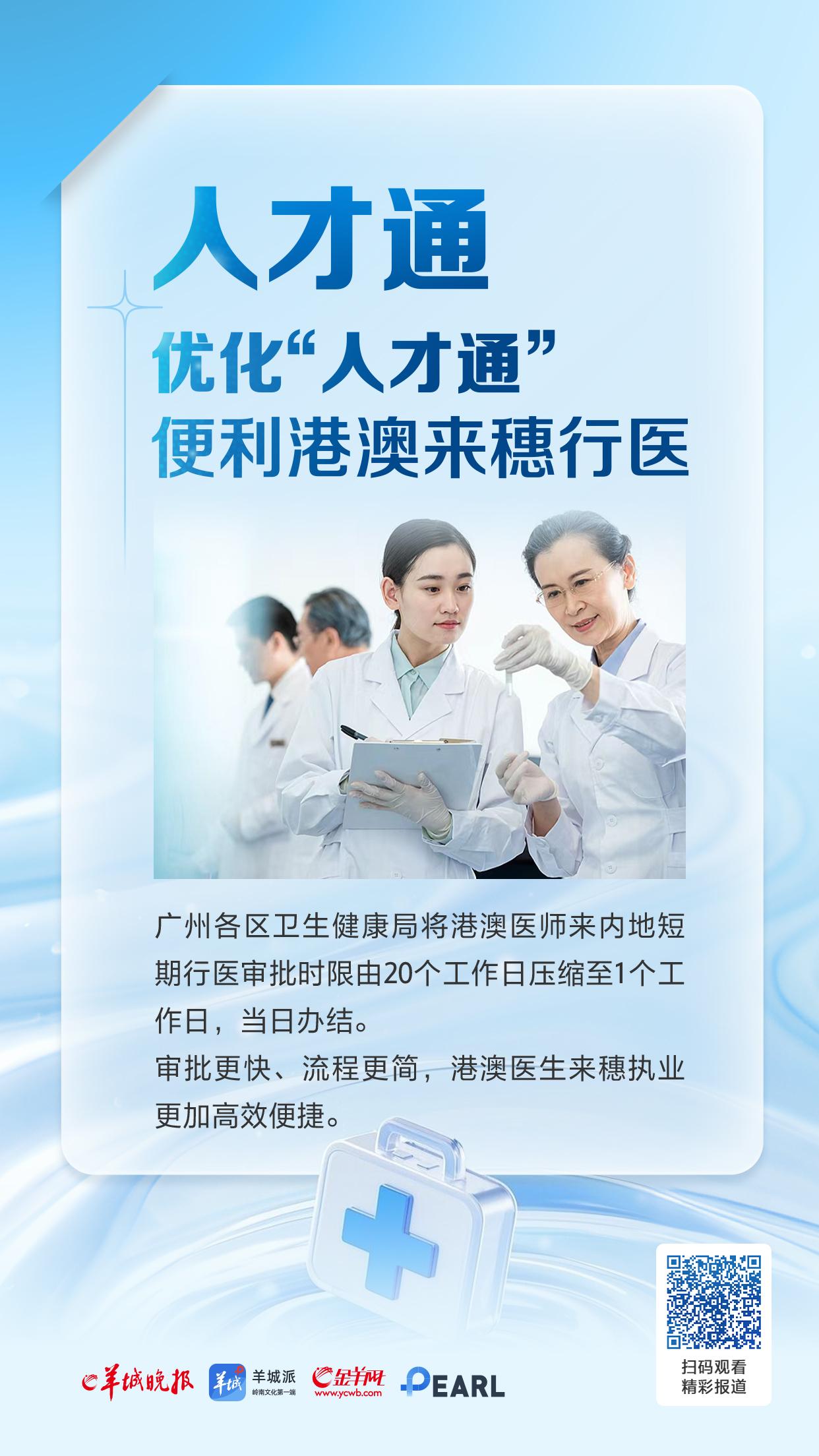 与此同时,广州还推进“人才通”,不断优化港澳来穗行医办医审批服务。目前,市卫生健康委已将港澳医师短期行医审批权限委托下放至各区卫生健康局,港澳医师只需按照广东政务服务网的要求将相关材料提交至辖区卫生健康局。各区卫生健康局已将港澳医师来内地短期行医核准的审批时间由20个工作日压缩至1个工作日,当日内可办结,极大提高审批效率,港澳医师来穗行医更加便捷。