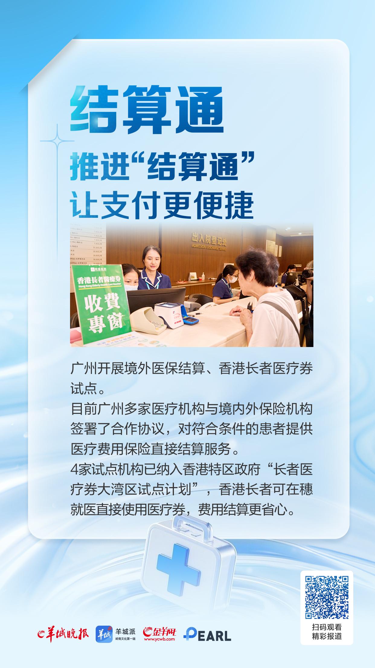 在结算方面,广州试点开展境外医疗保险结算服务,同时推进香港长者医疗券试点。目前,广东祈福医院、广州和睦家医院、广州市第一人民医院等多家医疗机构均与境内外保险机构签署了合作协议,对符合条件的患者提供医疗费用保险直接结算服务。