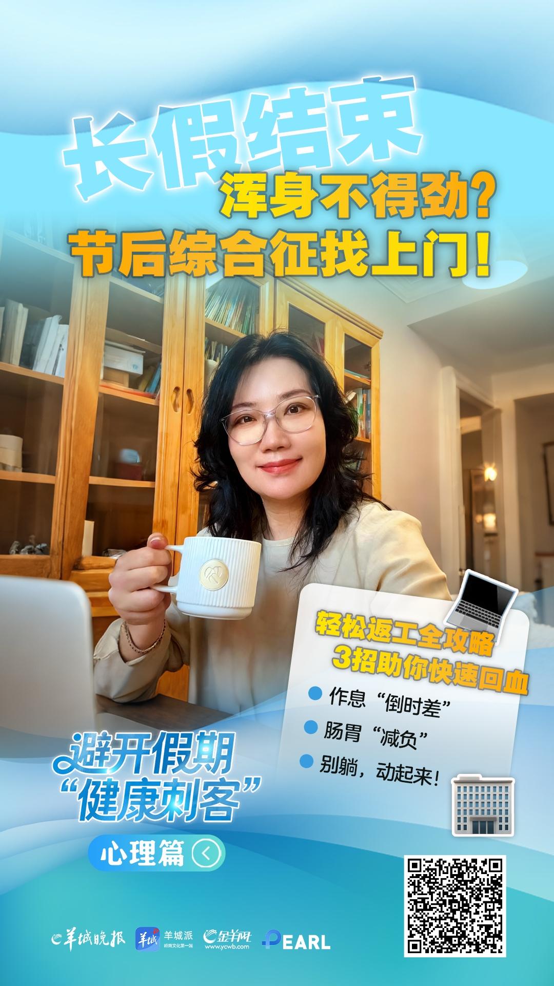 “外出旅游了10天,与朋友每天玩得十分开心,昨天一想到要回广州上班,就烦躁得睡不着。” 28岁的上班族陈女士的经历,是不少人的缩影。广州市第一人民医院精神心理科主任张璐璐指出,长假期间,人们往往会打破了日常作息的规律,比如熬夜玩乐、暴饮暴食、长途奔波,导致身体的 “生物钟” 被打乱。当假期结束,身心从 “松弛模式” 切换到 “工作模式” 时,就容易出现植物神经功能紊乱和免疫力波动,表现为一些典型症状,比如精神萎靡,犯困、打哈欠、注意力不集中,工作效率明显下降;同时存在一定的情绪焦虑,比如不想去上班,对上班产生抵触感,甚至出现烦躁、郁闷、沮丧等情绪;另外,就连肠胃道也出现不适,腹胀、消化不良、食欲不振,部分人还会出现腹泻或便秘;身体格外的疲惫,实际上明明没做重活,却感觉浑身乏力。
