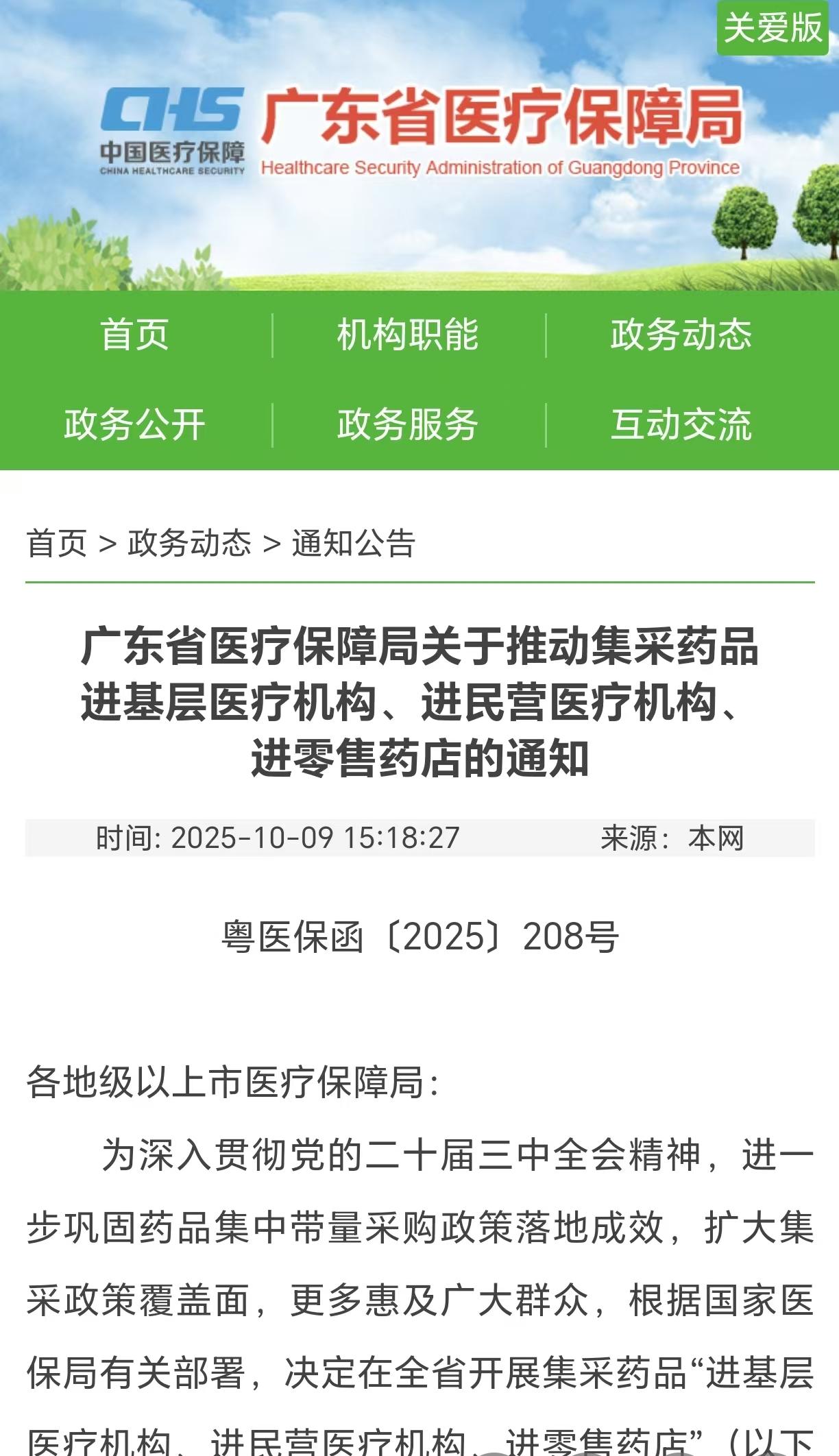 以往集采药品主要在公立医院销售,群众购药往往需要舟车劳顿。为扩大集采政策覆盖面,更多惠及广大群众,近日,广东省医疗保障局发布通知,广东在全省开展集采药品“进基层医疗机构、进民营医疗机构、进零售药店”(以下简称“三进”)工作,让街坊们在“家门口”就能买到质优价宜的药品。“三进”药品将以以常见病、慢性病用药为重点,定点零售药店或将设置集采药品专柜,对于刻意引导患者购买高价非中选药品的医务人员将被“扣分”。