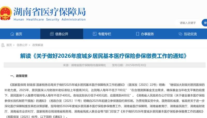 湖南省医保局的官方解读中引用了今年三部门文件在筹资方面的规定。《国家医保局 财政部 国家税务总局关于做好2025年城乡居民基本医疗保障有关工作的通知》(医保发〔2025〕22号)明确:“继续加大财政对居民医保的补助力度。2025年,居民医保人均财政补助标准较上年提高30元,达到每人每年不低于700元”“在合理测算基金支出需求,确保基金当年收支平衡的前提下,居民医保个人缴费可维持每人每年不低于400元。各地实际执行低于400元的,应提高到400元”。