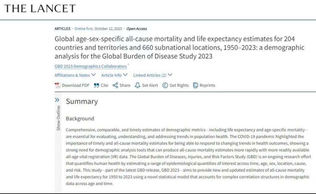 报告显示,与1950年相比,2023年全球经年龄标准化后的总死亡率下降67%,所有204个国家和地区均报告死亡率下降;全球女性预期寿命约为76.3岁、男性约为71.5岁,较1950年高20多岁。不过,预期寿命的地域差异与不平等显著,高收入地区寿命最高达83岁,而撒哈拉以南非洲地区最低仅为62岁。