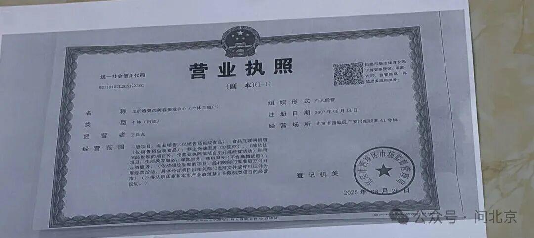 10月16日,记者随刘先生来到位于西城区南线阁街39号负一层的苏驰养生馆。在负一层大堂前台,随处可以看到店内张贴着“聖景健康22周年店庆”的广告。刘先生告诉记者,大堂内现在张贴的营业执照副本和他上次来店里时所看见的并不一样。9月张贴的营业执照上写的商户名称为北京二十四季中医药研究有限公司,而现在则为北京逸美尚美容美发中心。对此,苏驰养生馆的一位工作人员表示:“我们营业执照一直就是这个,你上派出所,我们也是这一个。”