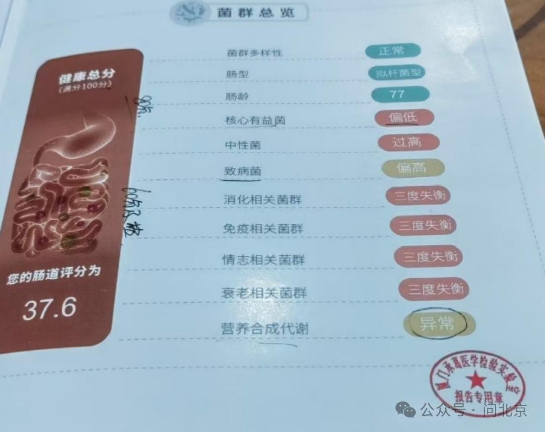 离开养生馆,记者又同刘先生前往位于朝阳区高碑店乡兴隆家园北门的聖世国际美容院,要求提供李阿姨曾做的菌群移植项目的检测报告。店内相关负责人在查阅档案后表示,检测报告已经被顾客取走,只能看到电子版。在李阿姨的菌群检测报告中,可以看到,出具报告的机构为厦门承葛医学检验实验室。报告显示,李阿姨的核心有益菌偏低,中性菌过高,消化、免疫、情志、衰老相关菌群三度失衡,营养合成代谢异常。
