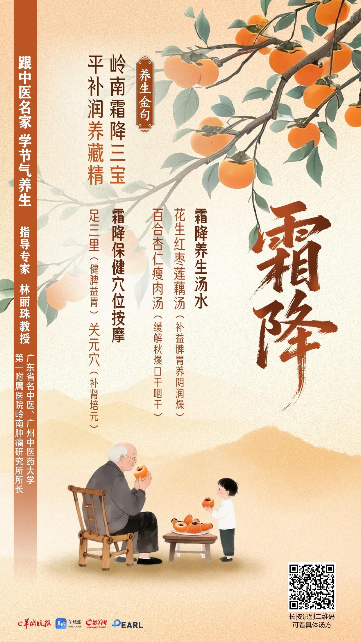 “草木摇落露为霜。”果然,广东在台风与大降温中迎来霜降,暑热尽退,凉燥之气渐盛。当北风渐紧,空气日益干燥,人体易感口鼻干涩、皮肤紧绷,旧疾关节也易在此时隐隐作痛。广东省名中医、广州中医药大学第一附属医院岭南肿瘤研究所所长林丽珠教授提醒,霜降养生,核心在于“润燥养阴、平补御寒”,谨记“岭南霜降三宝,平补润养藏精”,为即将到来的冬天打下坚实基础。