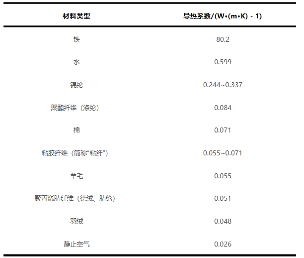 我们目前常用在保暖衣服中的羽绒、羊毛、棉等天然纤维,以及腈纶、粘纤、涤纶等,都是热导率相对比较低的材料。但如果要说目前世界上热导率最低的物质,还得是静止的空气。
