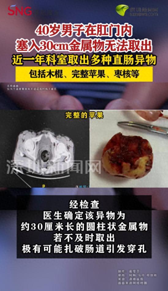 据了解,近一年内,该科室已从患者体内取出多种直肠异物,包括套有塑料外壳的木棍、完整的苹果、枣核等。
