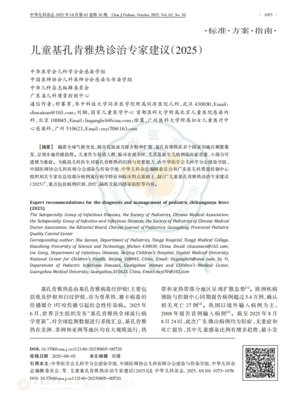 近日,由中华医学会儿科学分会感染学组等单位联合制定的《儿童基孔肯雅热诊治专家建议(2025)》(以下简称专家建议)正式发表于《中华儿科杂志》。广州医科大学附属妇女儿童医疗中心周文浩院长、龚四堂教授及感染科团队参与执笔。该文件是我国首部儿童基孔肯雅热诊疗规范,为蚊媒传染病防控与临床诊治提供了科学、权威的指导。