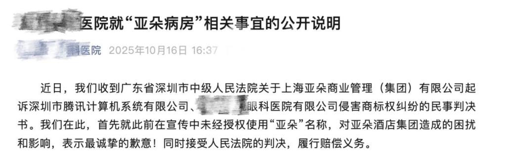 10月24日,某眼科医院打造“亚朵病房”被起诉一事,在社交平台上引发热议。该医院因涉嫌侵犯商标权被亚朵酒店集团起诉,法院民事判决认定医院构成侵权,要求其承担法律责任。人民日报健康客户端记者查询该院微信公众号发现,该院于10月16日发布了公开说明。