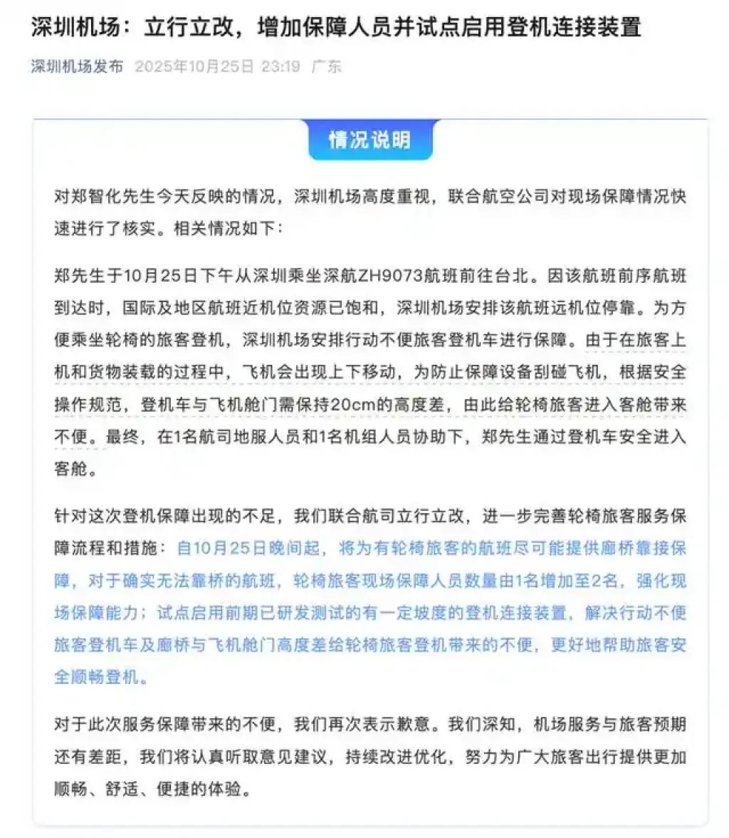 事件发酵后,深圳机场官方微博于当日傍晚发布声明,向郑智化致歉,并表示已启动核查。25日深夜11时许,深圳机场微信公号发文表示,机场联合航司立行立改,进一步完善轮椅旅客服务保障流程和措施:自10月25日晚间起,将为有轮椅旅客的航班尽可能提供廊桥靠接保障,对于确实无法靠桥的航班,轮椅旅客现场保障人员数量由1名增加至2名,强化现场保障能力。