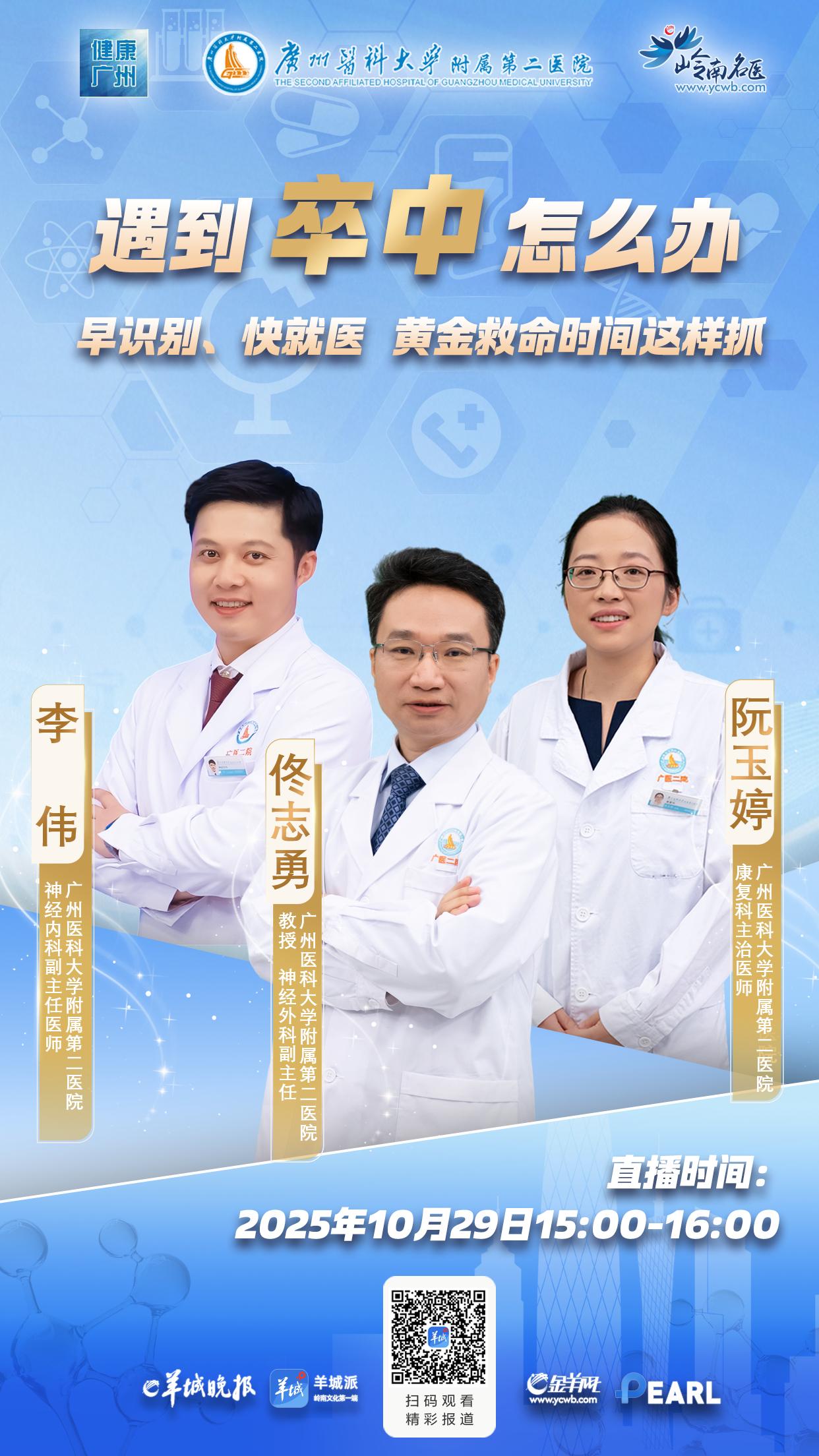 遇到卒中怎么办?早识别、快就医,黄金救治时间这样抓!今年10月29日是第20个“世界卒中日”,当天,羊城晚报“岭南名医”直播间邀请广州医科大学附属第二医院(以下简称“广医二院”)三位专家做客直播间,为广大网友带来专业、易懂的卒中防治知识。