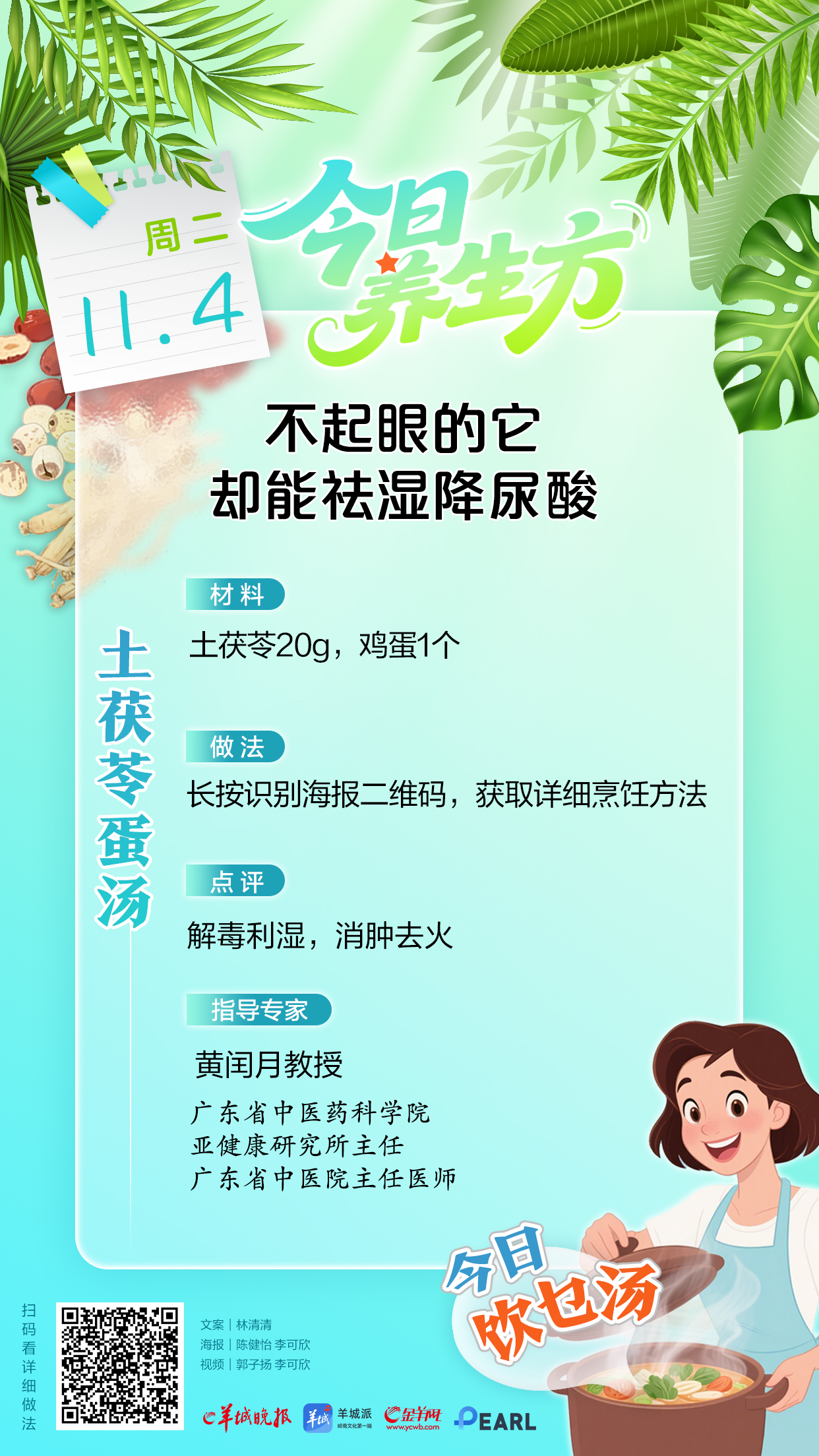 广东省中医药科学院亚健康研究所主任、中西医结合临床医学教授、广东省中医院主任医师黄闰月推荐一道土茯苓蛋汤,可解毒利湿,消肿去火。