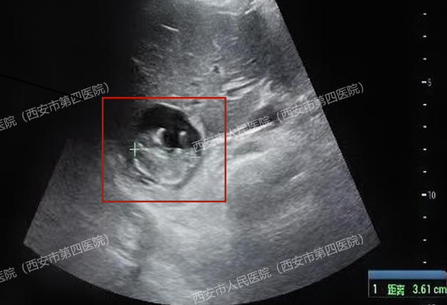 胎儿竟然长在了肝脏上!胎心搏动强劲有力,胎盘雏形也已形成,测量的顶臀径约36mm,估算的孕周近11周了!