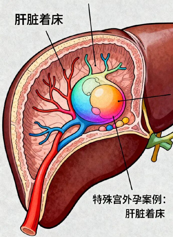 正常情况下,受精卵应着床于子宫腔内,特殊情况下,受精卵种植在子宫体部以外部位,即为异位妊娠,发生率约1.5%~2.0%。根据受精卵种植部位不同,异位妊娠可分为输卵管妊娠、卵巢妊娠、阔韧带妊娠、宫颈妊娠、腹腔妊娠等等,其中仅约1%的可能发生在腹腔,而肝脏妊娠又属于腹腔妊娠的“稀客”。