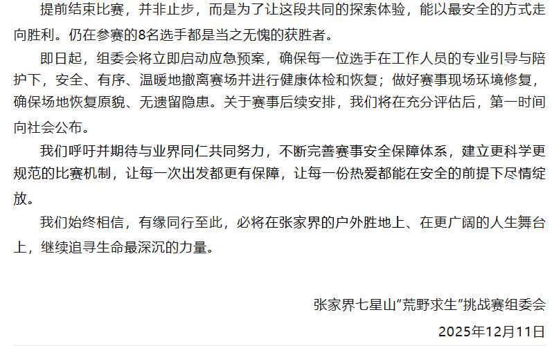 12月11日晚上,张家界七星山“荒野求生”挑战赛组委会突然发布《致张家界七星山荒野求生选手及广大“荒野人”的一封信》,信中称根据气象预报,张家界市即将经历一轮寒潮,并伴随大风、雨雪等极端天气。加之七星山山区气候复杂多变,昼夜温差极大,夜间最低气温预计将降至-5℃左右。在此类环境下开展野外生存活动,极易引发失温、冻伤、滑坠等严重安全事故,救援保障的难度与风险也将呈指数级上升。本赛事以“野外生存时间长短”为核心胜负标准,8名决赛选手已经参加较长时间的竞赛活动,在极端气候条件下,极易导致选手体力过度透支、判断力下降,甚至对身体造成伤害。经组委会慎重会商,决定提前结束第二季张家界七星山“荒野求生”挑战赛。