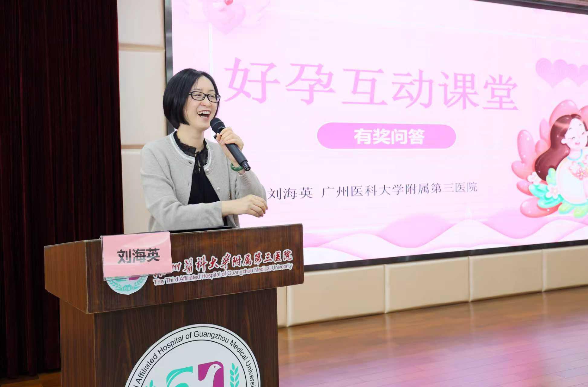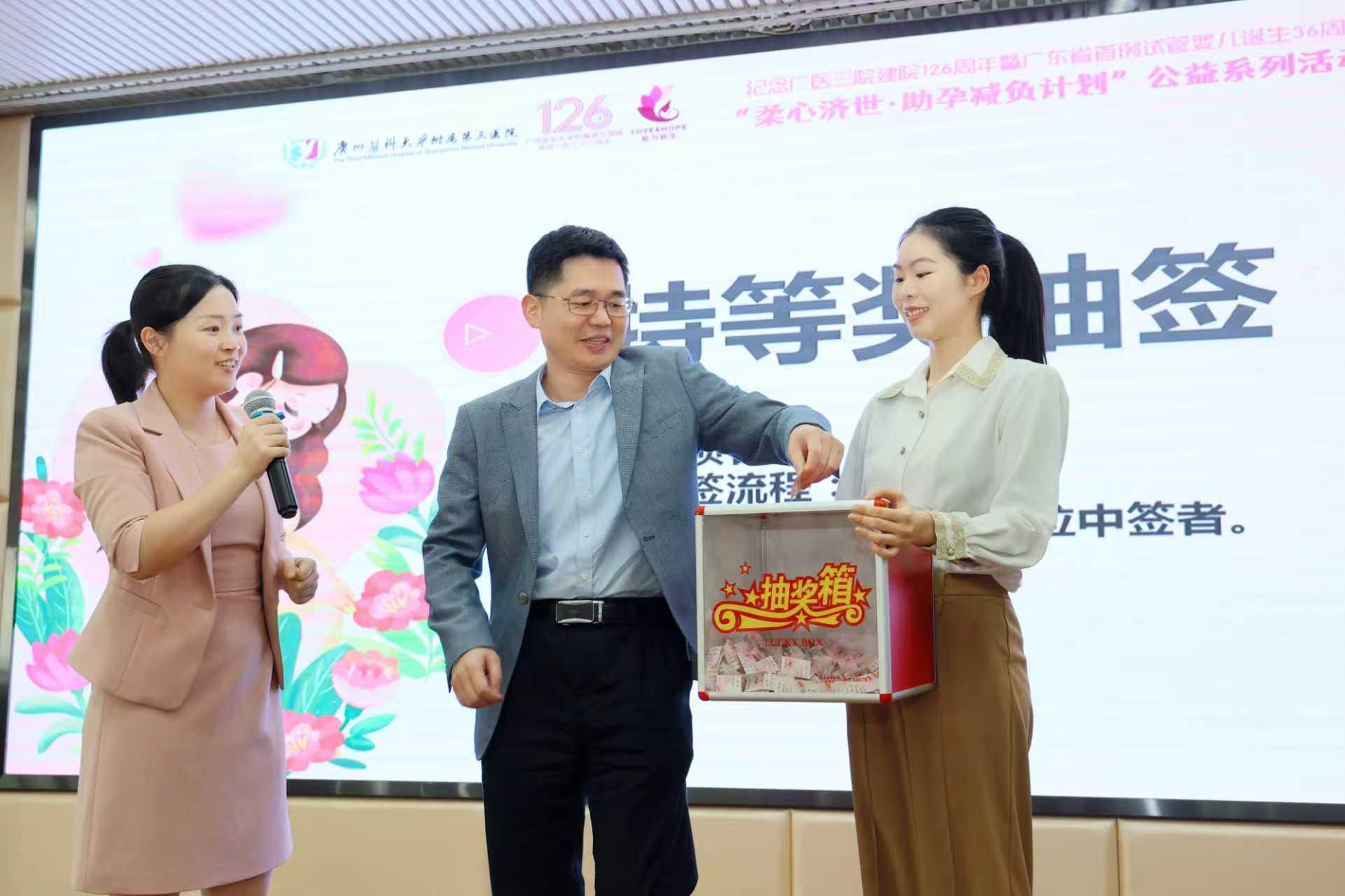 在热烈的掌声与艳羡的目光中,一位女士小跑上台,即使戴着口罩仍能感受到她的笑意,在她身边,广州医科大学附属第三医院(以下简称“广医三院”)生殖中心妇科主任刘海英送上拥抱,原来,这位幸运儿刚刚获得了试管助孕三等奖的福利,并获得了刘海英“全程助孕指导”的贴心礼包。