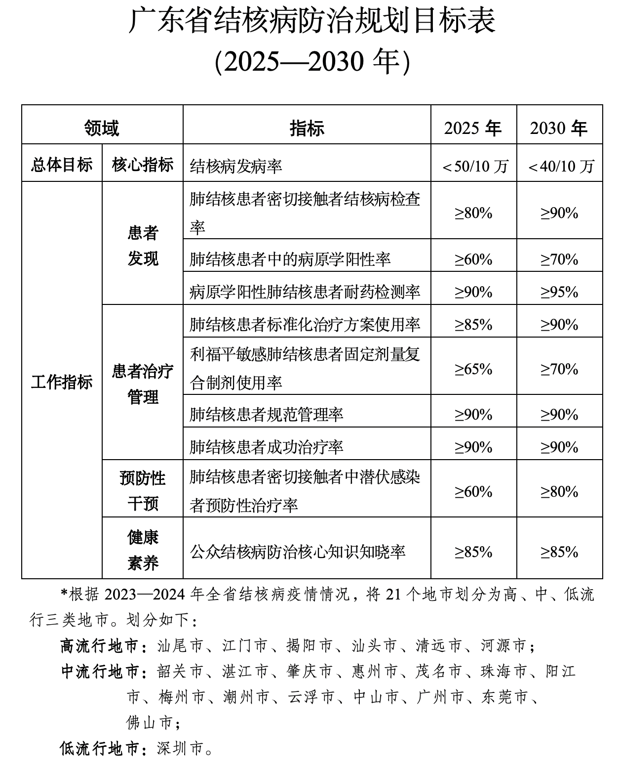 根据目标,到2030年,全省结核病发病率下降到40/10万以下。其中,高、中、低流行地市结核病发病率较2023年分别下降25%、20%、15%。