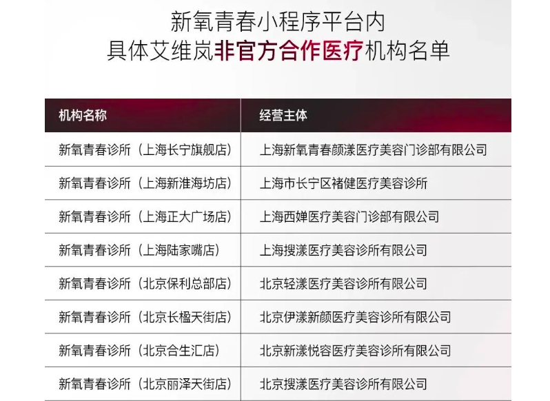 不止斐缦生物,另一家厂商普丽妍也在11月22日发布了一份名单,将40余家新氧青春诊所列为“非官方合作医疗机构”。