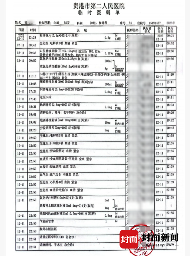 晚上10点多,当家属再次被允许接近时,看到安富生正在实施抢救。“我们过去的时候,已经在抢救了,后来就说呼吸心跳停了。”安女士哽咽着说,历经一个多小时的抢救,安富生于12月12日凌晨因抢救无效被宣告临床死亡。