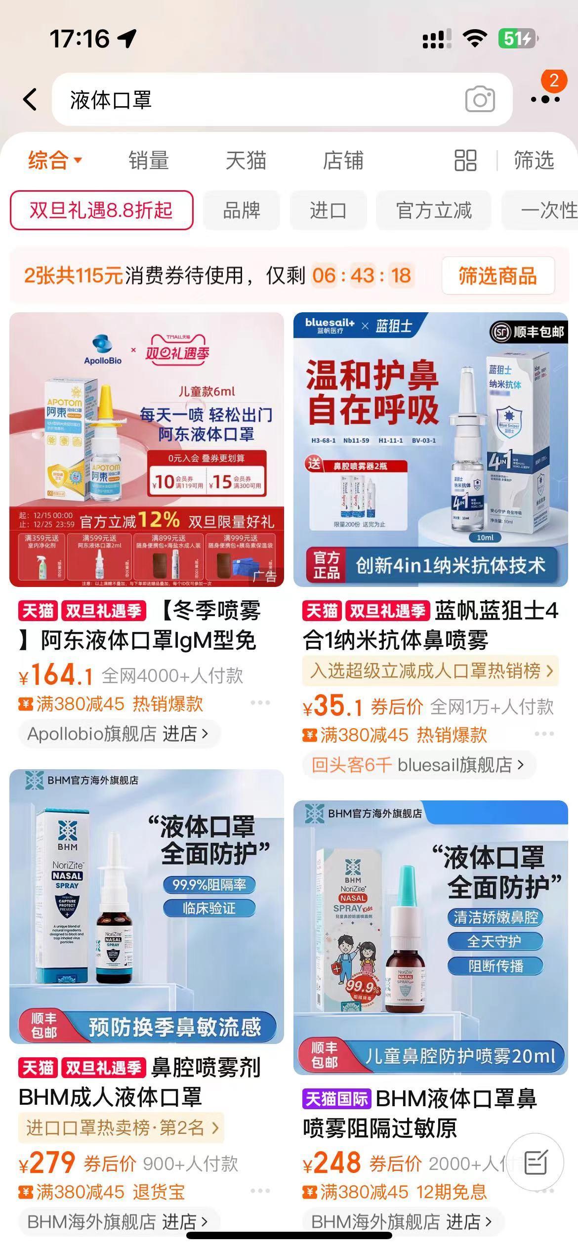 搜索多家电商平台发现,目前市面上的“液体口罩”品牌众多,包括阿东、BHM、百畅悠、呼保等,声称非药物或者天然成分,其核心配方是在鼻腔喷一层含卡拉胶或其他高分子的凝胶膜,以物理隔断阻挡病毒。