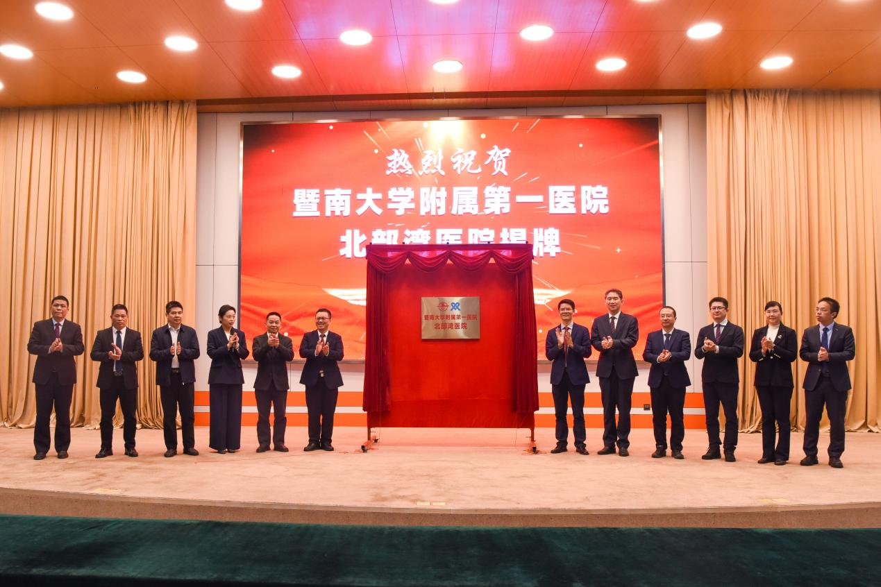 签约仪式上,廉江市市长柯俊、暨南大学附属第一医院副院长张晓慎、廉江市人民医院党委书记全湛伟共同签署协议,并为“暨南大学附属第一医院北部湾医院”与“廉江市人民医院医技综合楼”揭牌。