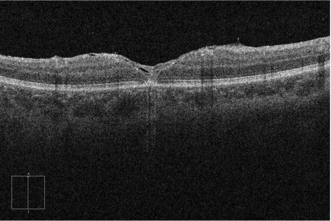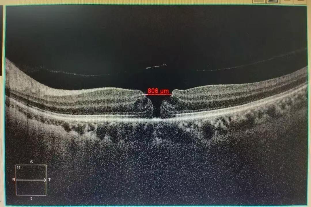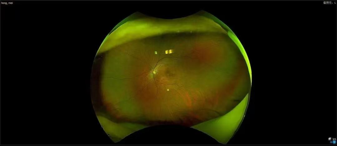 近一周,左眼视力下降加剧,严重影响吃饭、走路,洪女士才赶往广州市花都区人民医院眼科就诊。接诊医生结合症状高度怀疑黄斑病变,为其安排OCT(光学相干断层扫描)及欧堡超广角眼底检查,最终确诊为左眼全层黄斑裂孔并收治入院。