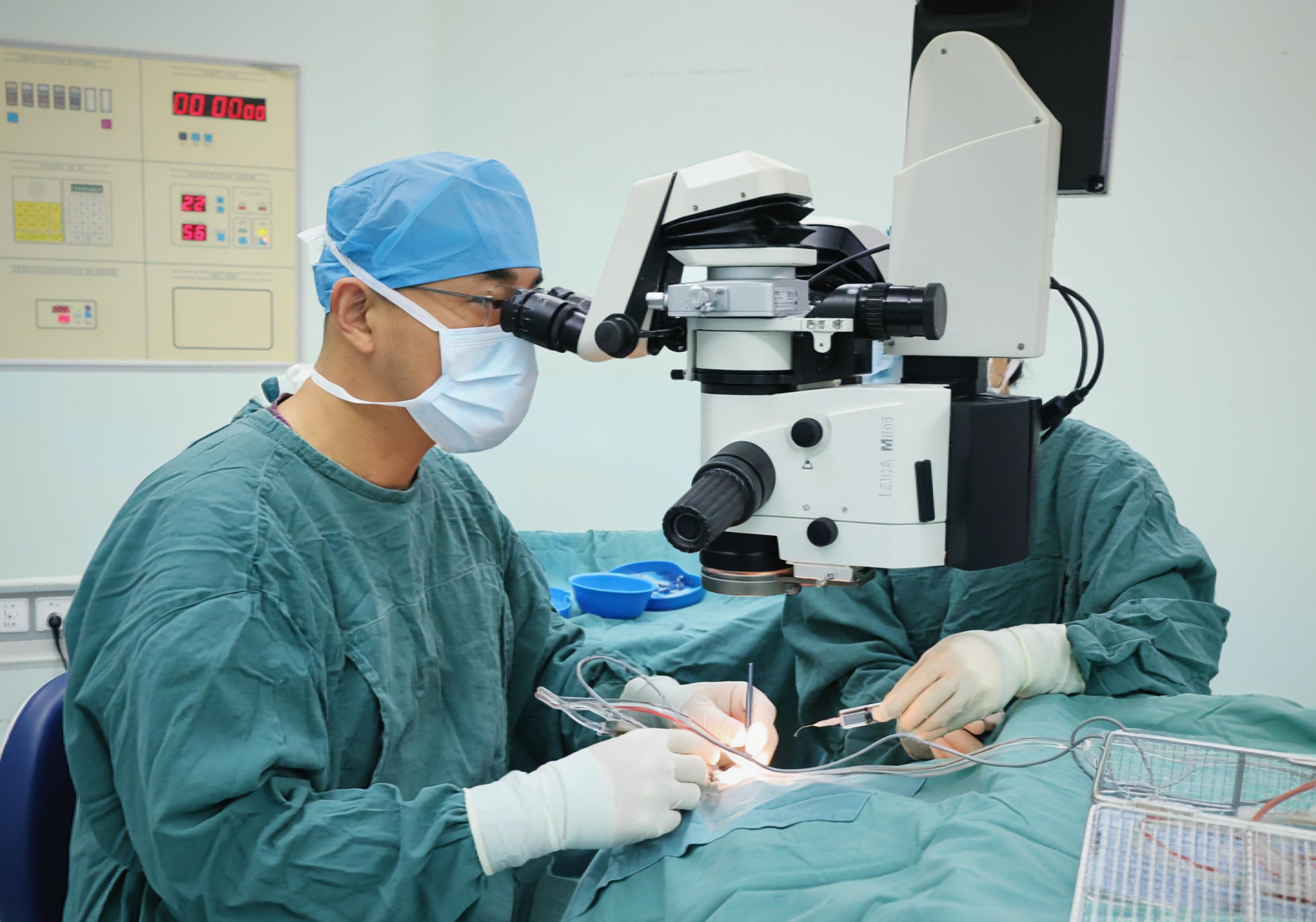 黄斑裂孔修复手术属眼科四级手术,技术难度极高,全程需在高倍率显微镜下操作,对术者的精准度和临床经验要求严苛。手术台上,白建海主任带领团队沉着施术:先为洪女士摘除白内障并植入人工晶体,再切除玻璃体,剥离牵拉黄斑的内界膜并采用翻转技术覆盖裂孔,最后注入空气顶压裂孔促闭合,全程精准流畅。