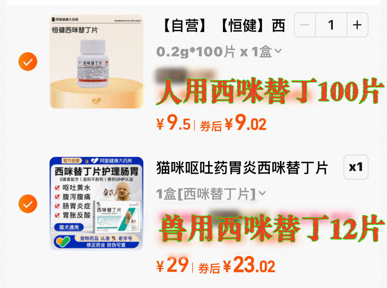 药品领域的价差更为直观。记者调查发现,普通100片装的人用复合维生素B片,网上售价仅六七元,而容量相同的宠物用维生素B片,价格至少15元,部分高端产品甚至达到五六十元;在同一家网上药店,治疗消化不良的人用西咪替丁药物,一小瓶售价仅9元多,而同款功效的宠物用药,一小盒12片就卖到23元以上,单价相差近3倍。