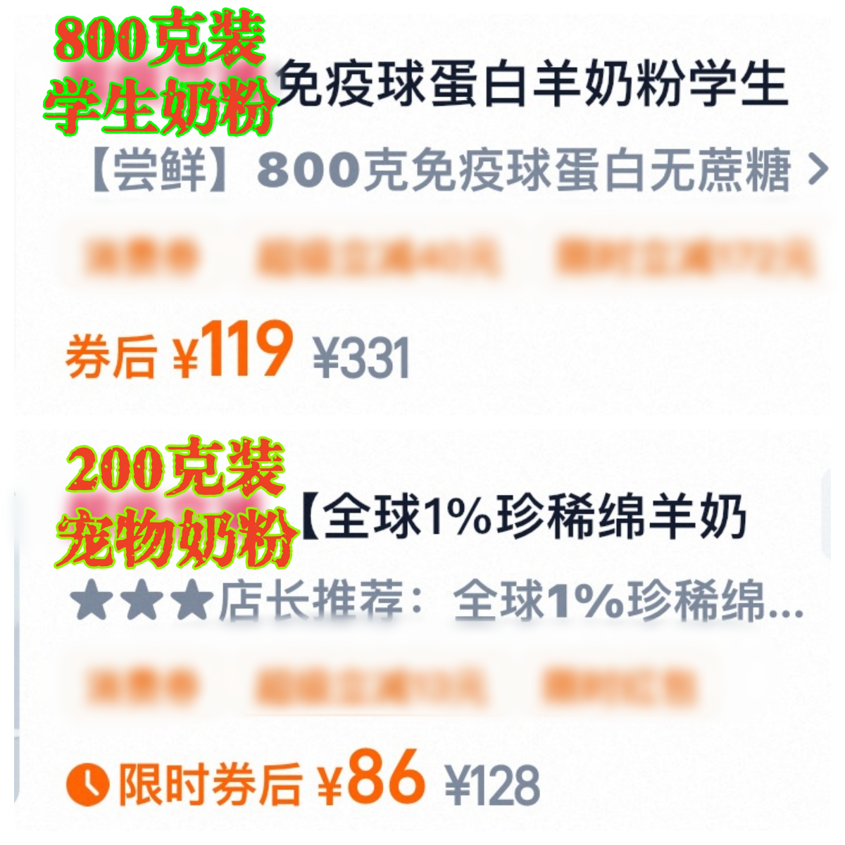 在电商平台上,一款200克装的“幼猫专用”绵羊奶粉标价86元,而800克装的学生强化羊奶粉售价仅119元。主打“0乳糖配方”的宠物羊奶粉价格竟是学生羊奶粉的3倍。