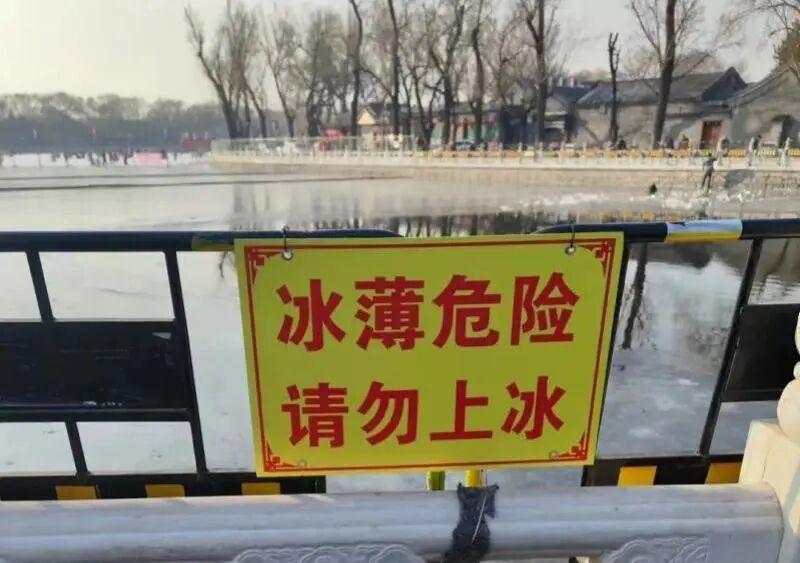 受气温变化影响,冰层厚薄不一,受到外力作用极易开裂。捕鱼、钓鱼者遗留下的冰窟窿,行人误踩易引发危险。